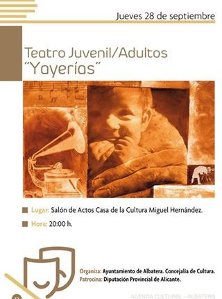 Esta tarde a las 20:00 horas se interpretará «Yayerías» representación juvenil y de adultos en la Casa de Cultura Miguel Hernández de Albatera. Actividad organizada por la Concejalía de Cultura del Ayuntamiento de Albatera y patrocinado por la Diputación de Alicante, enmarcada dentro del ciclo cultural de septiembre.